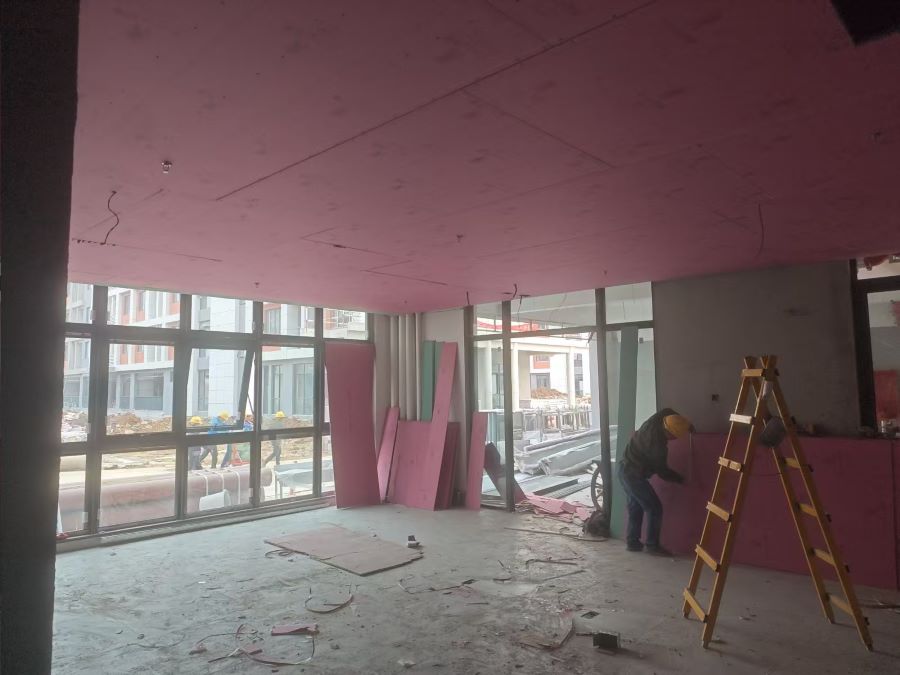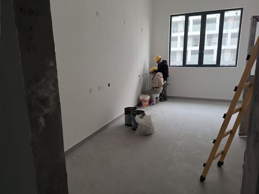 2.9号宿舍楼:一层大厅石膏板吊顶累计完成80%;卫生间隔断完成至七层;阳台内侧饰面造型完成;北侧铺砖累计完成50%。