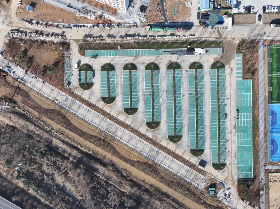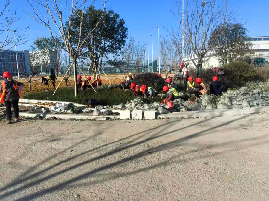 6.室外工程:停车场区域铺装绿化基本完成;铺装总体累计完成90%,绿化总体累计完成80%。