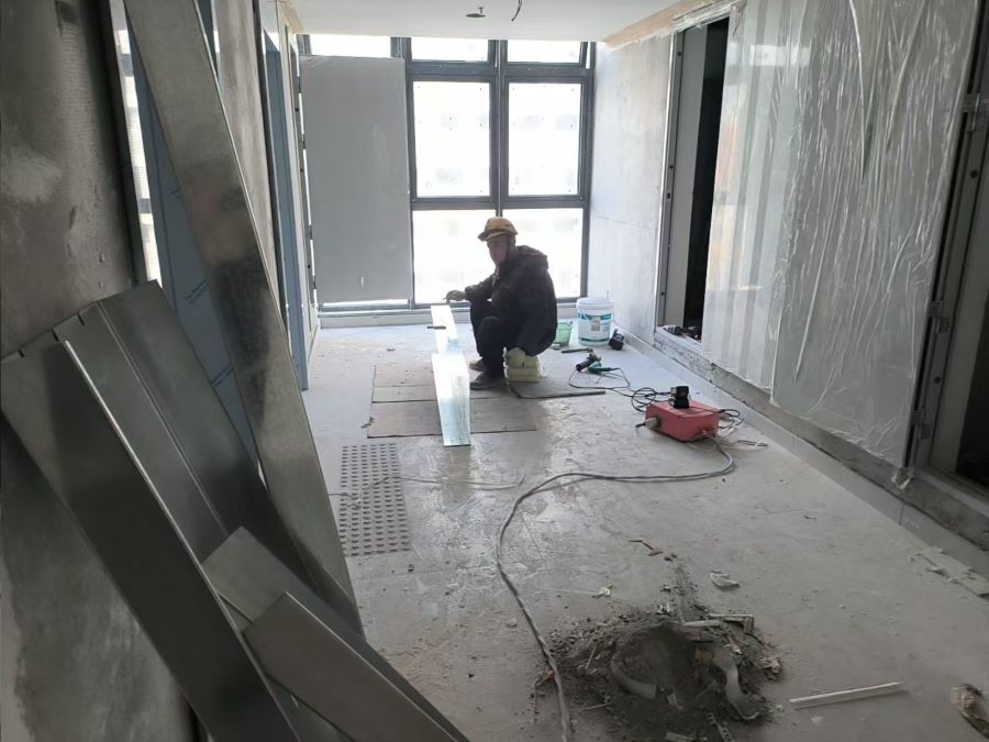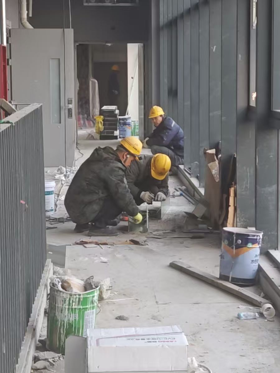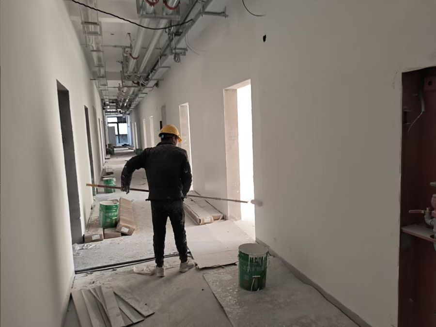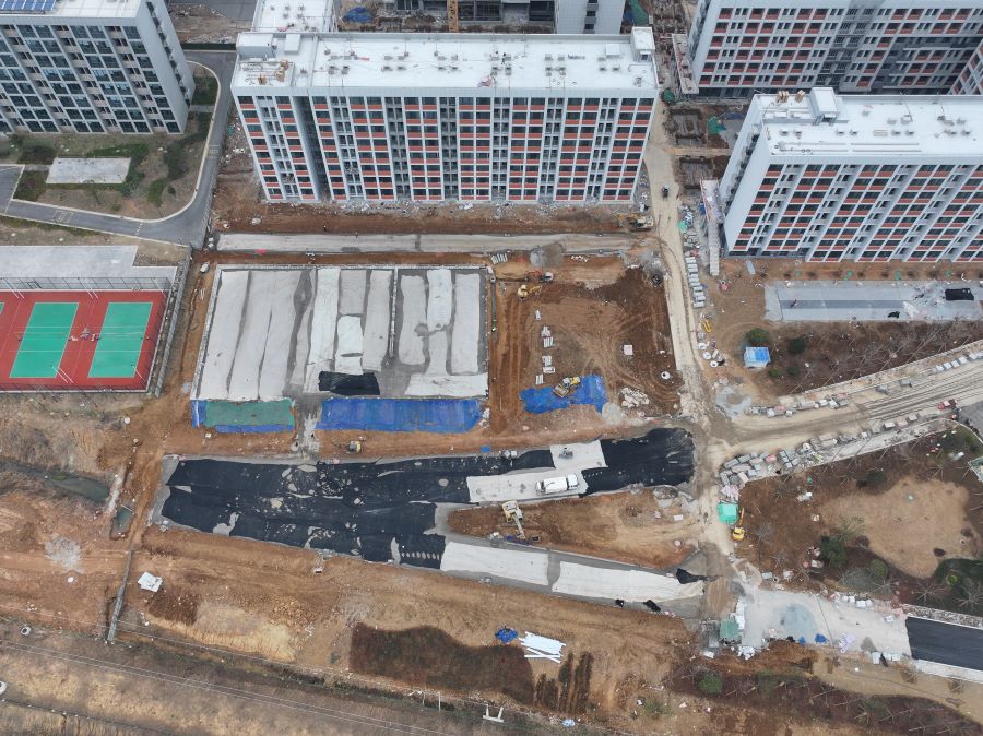 2.9号宿舍楼:一层大厅石膏板吊顶完成;卫生间隔断累计完成90%;北侧铺砖完成。